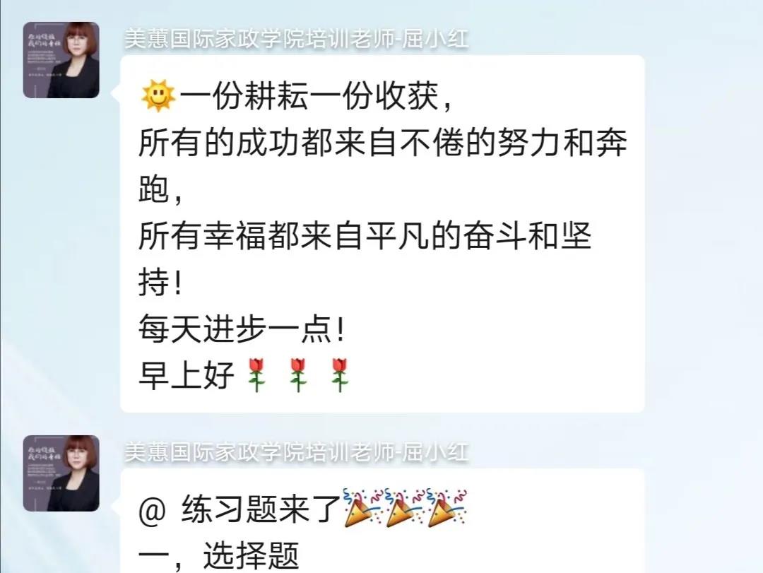 在班级群里,老师会在学员群中督促学员听课、做题,完成当天的学习任务,并且在正式开课前和完成考核后,通过微信群完成“开学”与“结课”。